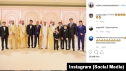 Дар акс дида мешавад, ки амири Дубай дастонашро рӯи шонаҳои писари Мирзиёев гузоштааст ва домодҳои раиси ҷумҳури Узбекистон дар як саф бо писарони шайх истодаанд.