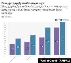 Таксиҳо ҳам аз болоравии нарх канор намемонанд. Агар ҳоло мусофирон барои ҳар километри ҳаракат дар таксӣ 2,5 сомонӣ мепардозанд, пас аз 10-уми ноябр ин нарх 3 сомонӣ мешавад.